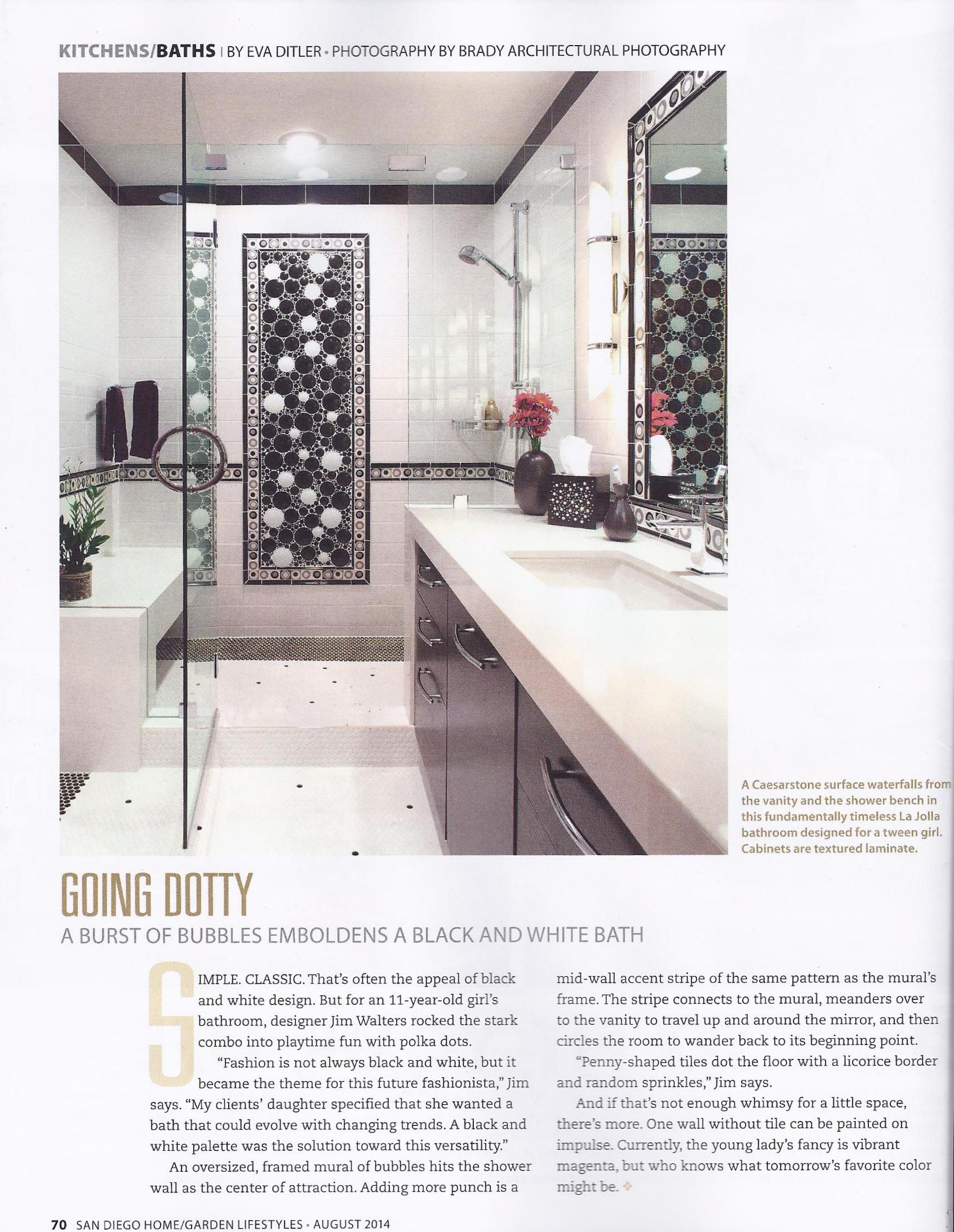 Our client’s young daughter was rather jazzed to participate in the look of her new bathroom! Wanting versatility, she decided black and white would evolve with changing design trends. We hit the walls with an oversize framed mural of amazing bubble tiles as a featured attraction, then tied this look into the vanity and mirror by circling the room with a mid-wall accent carrying the same pattern. We left one wall without tile so that this young gal can change its paint to whatever becomes a new favorite color in the years to come!